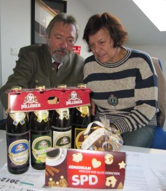 Am Montag vor der Kreistagssitzung trafen fast zeitgleich zwei Besucher ein: Kreisrat Arno Wolf - er hatte flüssige Nervennahrung dabei: Eine Spezial-Auswahl von Bieren aus Pfeffenhausen. Und Kreisrätin Ruth Müller hatte etwas Süßes im Gepäck: Eine Auswahl selbstgebackener Plätzchen. Sozusagen ein "Care-Paket", damit an den letzten hektischen Tagen vor Weihnachten die Arbeit noch mehr Spaß macht.